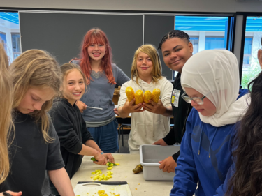 Once the crops had matured, students harvested the vegetables and prepared them for the soup. As they chopped, minced, and diced the vegetables, they participated in a class discussion about the life cycle of the vegetables and other organisms involved in the process. The corn was food for aphids, which in turn are food for natural pest-controlling predators such as wasps and ladybugs. The vegetables themselves worked together once more to become nourishment for the students. The carbohydrates in the corn, fibre and proteins in the beans, and vitamins in the squash combine to create a nutrition powerhouse.